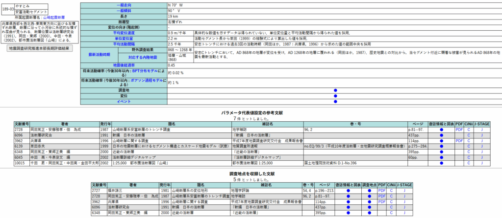 情報を取りに行くには、産総研「活断層データベース」というものがあります。