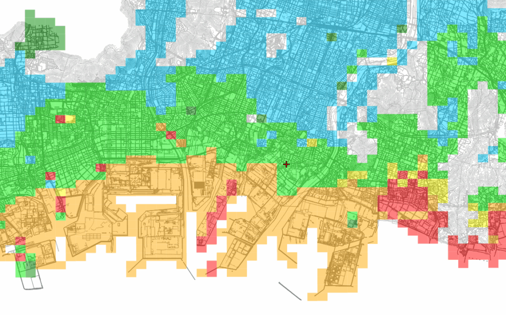 姫路市の図では、水色以外の黄緑・緑はオレンジ「液状化危険度は高い」、黄色は赤「液状化危険度は極めて高い」となります。大丈夫ですかー?。もっと赤々としたマップになるはずです。