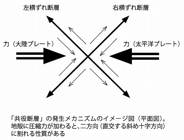 共役断層とは、図に示すように、地殻に水平方向の同じ圧縮(または引張り)力が働いたとき、互いに断層面が直交し、ずれの向きが逆向きになる断層の組のことをいいます。