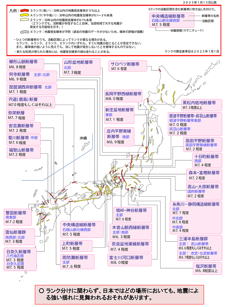 これによると、山崎断層は今後30年以内に地震が発生する確率が0.1%~1%未満の「Aランク」とされ、Sランクに次ぐ2番目に危険なランクということになっています。