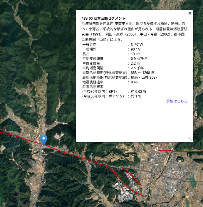この中の「起震断層・活動セグメント検索」から調べると、以下のような解像度で位置関係が全国どこでも確認できます。