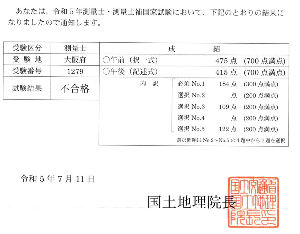 不合格の場合、以下のように具体的な点数が通知いただけます。20点足りてません。100点満点換算で1.4点でした。合格すると、何点取ったかは不明の通知書です。